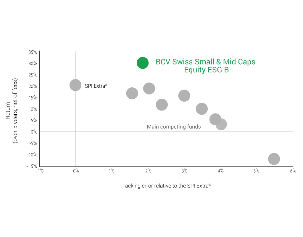 The investment universe includes all Swiss companies listed on the Swiss stock market, except for the 20 largest caps.