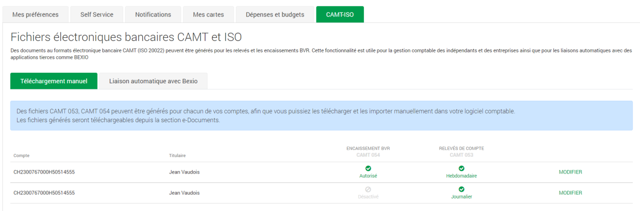 By authorizing electronic account reports in BCV-net, you can import your data directly into your accounting software for a more automated process. Various ISO 20022 (XML) message formats are available.