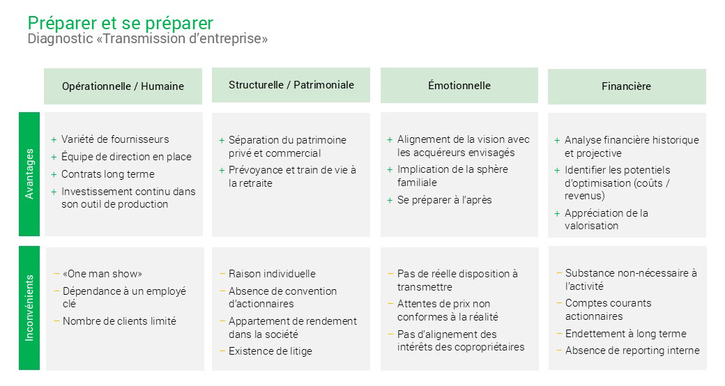 Une fois ce chapitre éclairci, au tour de l’entreprise. Il s’agit de la préparer pour en retirer le meilleur prix possible. Cela signifie notamment s’assurer que le savoir et le savoir-faire sont transmissibles, que les processus sont clairs, que la clientèle est identifiable, que le bilan est présentable ou que l’outil de production est à jour. Des difficultés peuvent surgir du fait que vous possédez l’entier des processus dans votre tête, que vous dépendez d’un nombre restreint de clients, que votre bilan comprend des éléments inutiles pour l’acquéreur. Si vous êtes plusieurs actionnaires, avez-vous échangé suffisamment tôt entre vous, êtes-vous sur la même longueur d’onde? Et au sein de votre famille, tout le monde est-il au courant des démarches?
