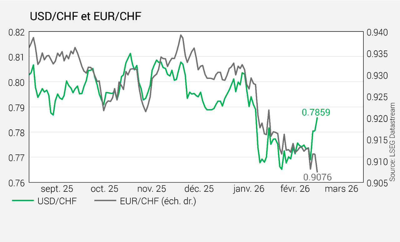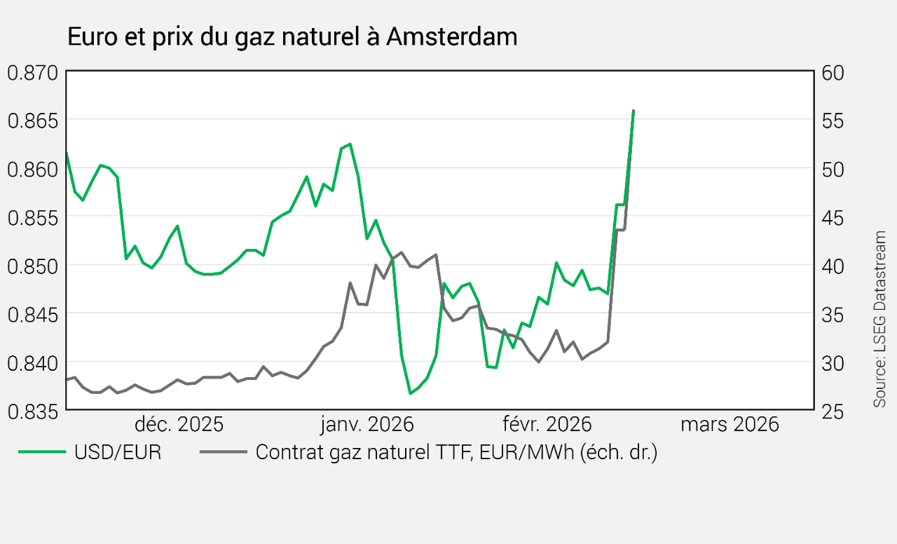 Quelques jours après son déclenchement, la guerre israélo-américaine contre l’Iran a pris une dimension régionale. L’aversion au risque prend l’ascendant sur les marchés après une réaction initiale relativement modérée. L’inquiétude se concentre autour de l’énergie, avec des tensions qui affectent à la fois le pétrole et le gaz, ainsi qu’autour des chaînes logistiques. Le franc a connu une poussée de fièvre, incitant la BNS à sortir de sa réserve lorsque l’EUR/CHF s’est approché du niveau de 0,90.